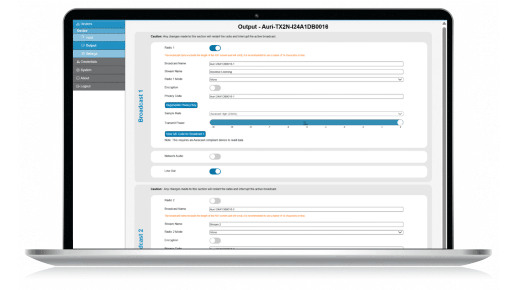 The Transmitter output power should be adjusted to suit the install environment, in smaller spaces the Transmit Power should be reduced to avoid excessive signal being broadcast into adjacent areas. Where there are lots of Auracast systems operating in close proximity careful management of output power will result in better performance and a cleaner experience for the end users. Coverage should be validated in normal use of the space to ensure the Transmit Power is set appropriately for when the space is fully occupied.