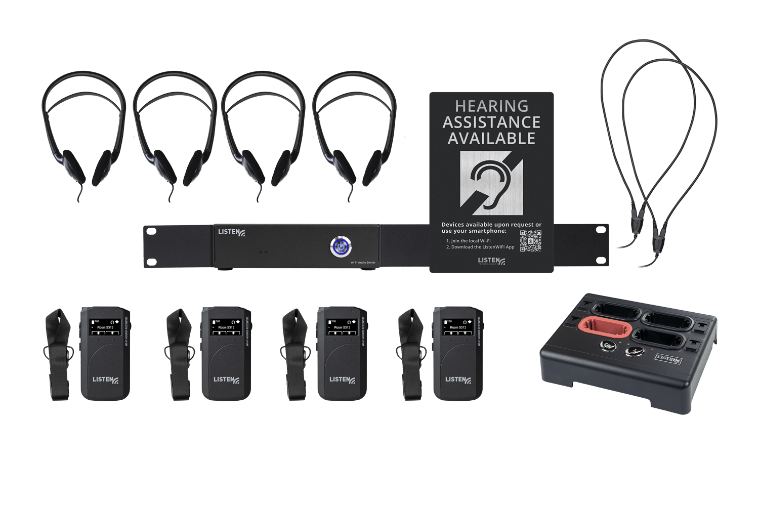 Furnish and install an audio over Wi-Fi assistive listening system (ALS) for use in hard to hear environments and for the hearing-impaired. The Wi-Fi Audio Server shall be capable of broadcasting 2 Dante® audio channels over an existing local area network to listening devices on both the 2.4 GHz and 5.0 GHz unlicensed Wi-Fi bands. The server shall be rack mountable in 1 RU 19” rack space, with no user control interface on the server to prevent tampering and facilitate easy setup and operation via software control. Listening devices shall include smart phones and tablets with the ListenWIFI mobile app installed, as well as dedicated Wi-Fi Audio Receivers for assistive listening compliance or as backup devices. The system shall support 2 audio channels for 500 listening devices and shall be expandable by adding additional servers.