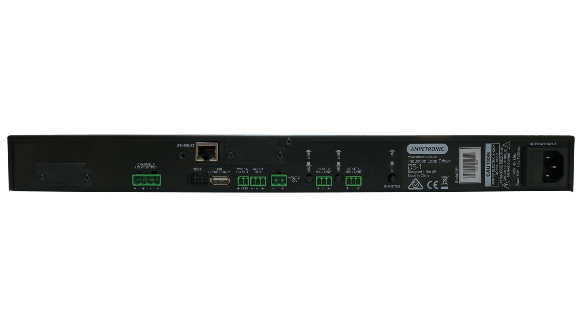 In a Perimeter Loop application it shall cover up to 240 sq. m (2,584 sq. ft.) in a square aspect area. The driver shall have a frequency response of at least 80Hz to 6.5kHz +/- 3 dB with THD+N less than 0.2%. The unit shall incorporate (AGC) Audio Gain Control optimized for speech with a compression dynamic range of >36 dB audio processing. The unit shall incorporate Dual Slope Metal Loss Correction to rectify frequency loss caused by adjacent metal structures. The unit shall incorporate built in test signals and shall be fully networkable with a standard browser based control panel for remote set-up, monitoring and email alerts. The unit shall incorporate a RJ45 ethernet input supporting 2 channels of Dante or AES67 at 44.1kHz or 48 kHz sample rates. The unit shall occupy one rack space and rack mount brackets shall be included. The Perimeter Loop driver is tested to and compliant with: IEC 62489-1 induction loop amplifier performance standard.